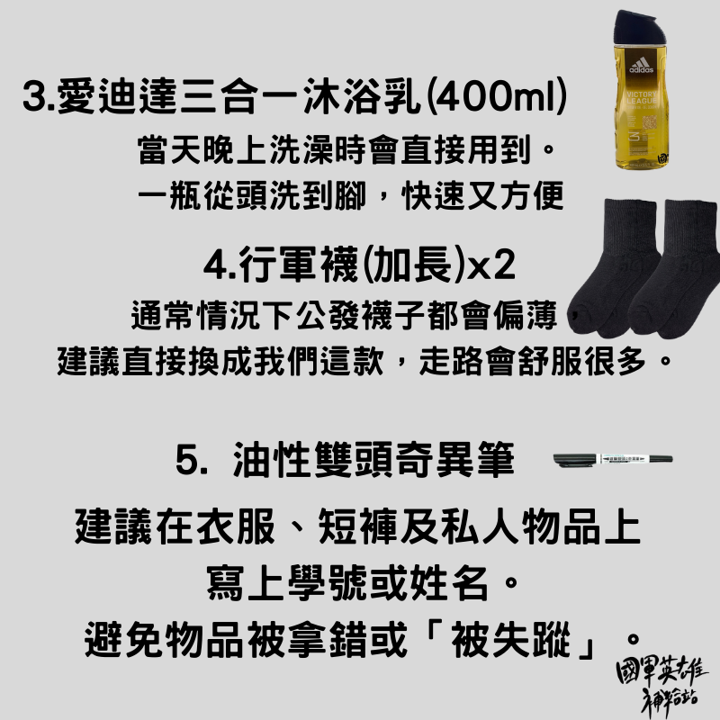 🔸行軍襪(加長)*2 :一進去穿上尺寸不太合的大頭皮鞋開始無止盡的操課、行軍(全副武裝走路、跑步、爬山 )有一雙比公發厚的襪子會舒服很多!