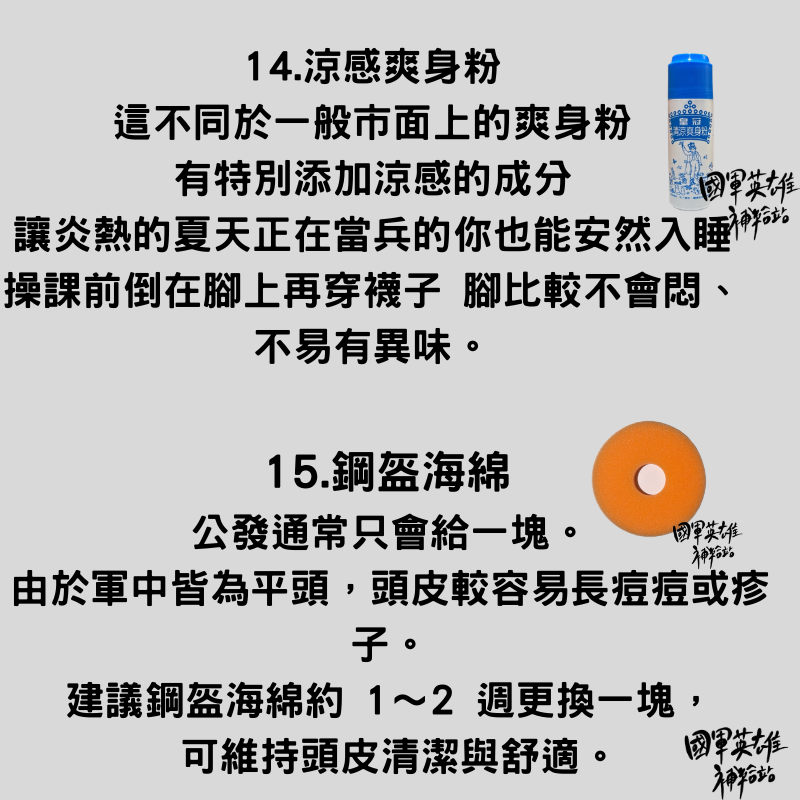 🔸涼感痱子粉:軍營裡大概八成的時間是沒有冷氣的,大太陽之下痱子粉可以讓你身體不會有黏膩感,讓你清爽舒服的操課