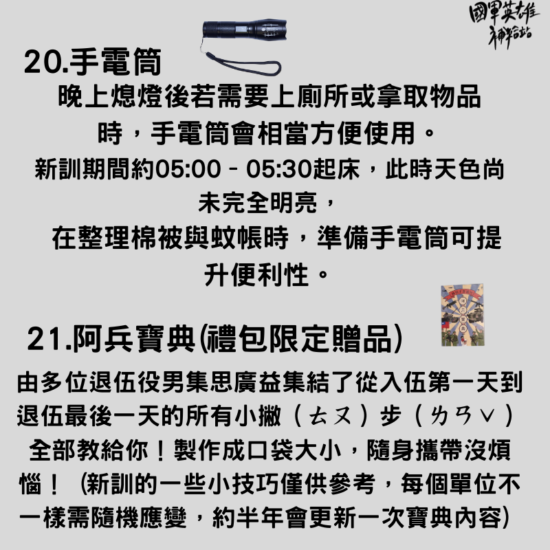 🔸阿兵寶典:由多位退伍役男集思廣益集結了從入伍第一天到退伍最後一天的所有小撇(ㄊㄡ)步(ㄌㄢˇ)全部教給你!製作成口袋大小,隨身攜帶沒煩惱! (新訓的一些小技巧僅供參考,每個單位不一樣需隨機應變,約半年會更新一次寶典內容)