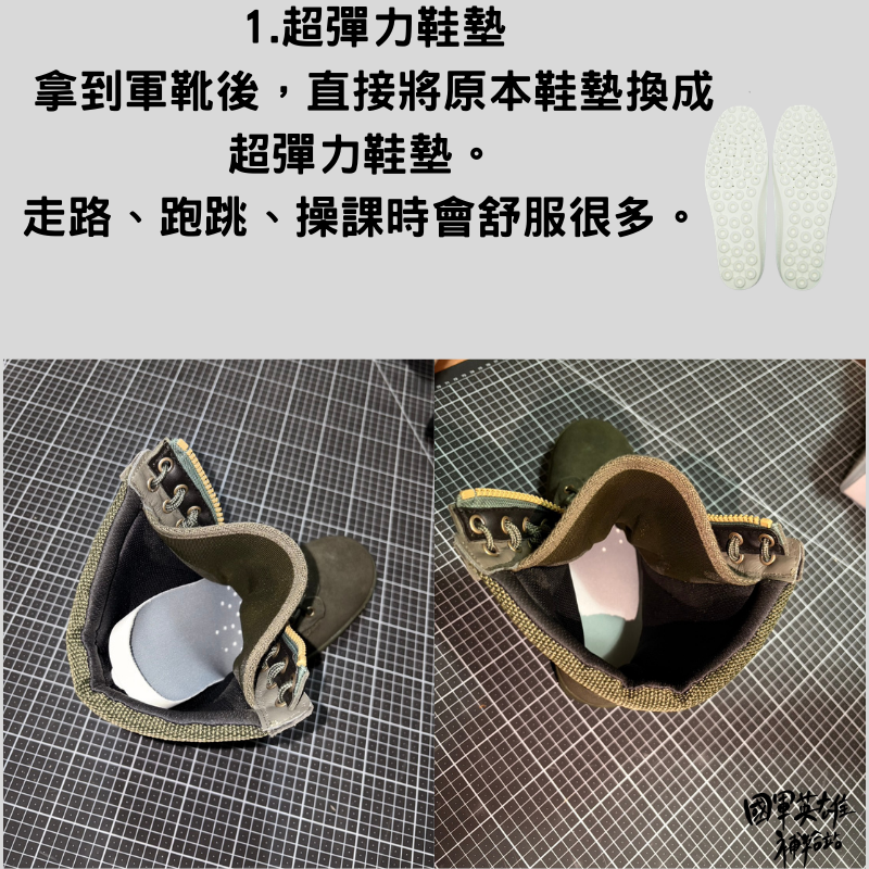 🔸超彈力鞋墊:建議拿到軍靴後立即更換,提升支撐與緩震效果,減少長時間站立與行軍造成的不適感