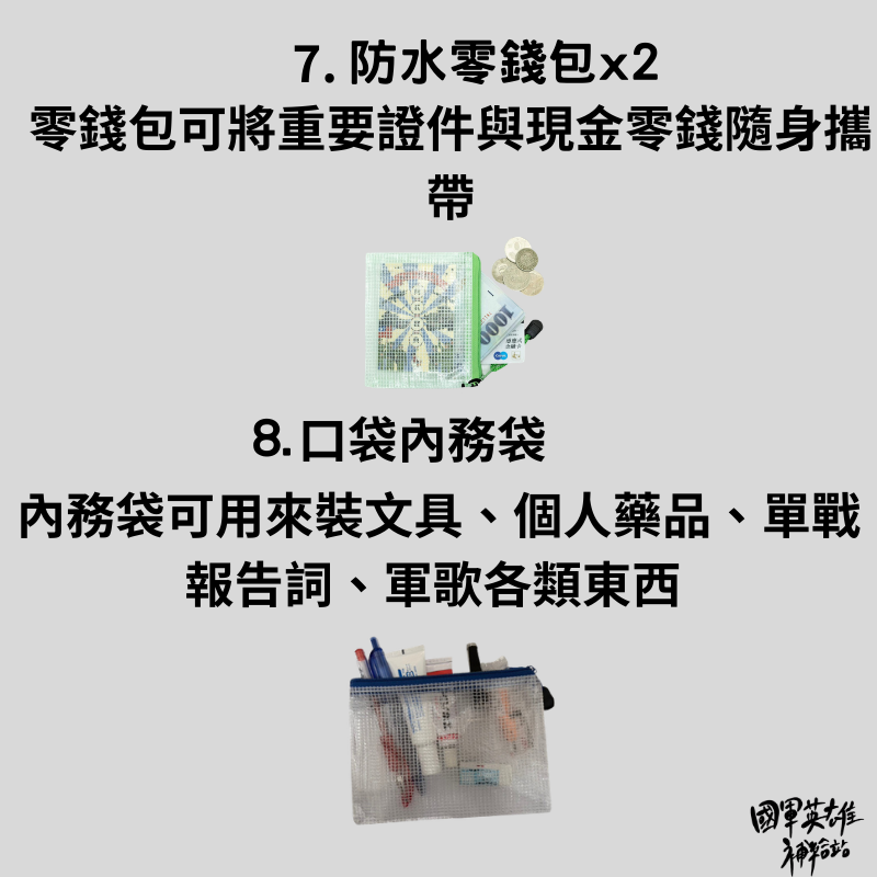 🔸防水零錢包*2:讓你放零錢或是裡面發的一些需要你隨身攜帶的紙張例如軍歌、單戰報告詞,防水在於不被你的汗把紙張弄爛!