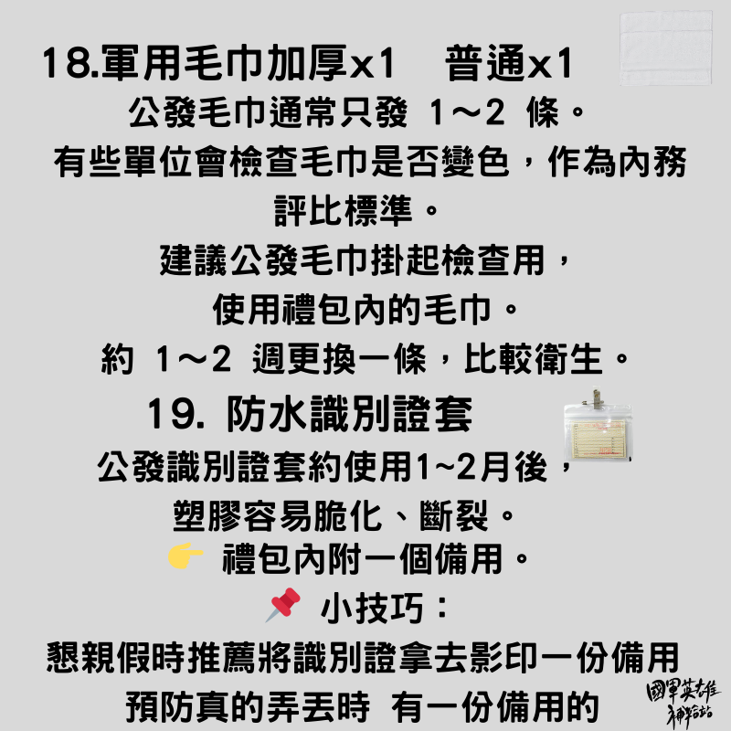 🔸白毛巾 普通*1 特厚*1 :軍中只許用特定尺寸的白毛巾,他們會發,但是只給你一兩條且非常非常容易髒,所以這邊附上兩條讓你做替換,分別是普通款毛巾x1 特厚款毛巾x1 一條擦臉一條擦身體