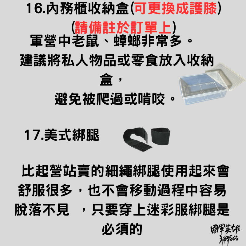 🔸美式綁腿: 比起營站賣的細繩綁腿使用起來會舒服很多也不會移動過程中容易脫落不見 只要穿上迷彩服綁腿是必須的